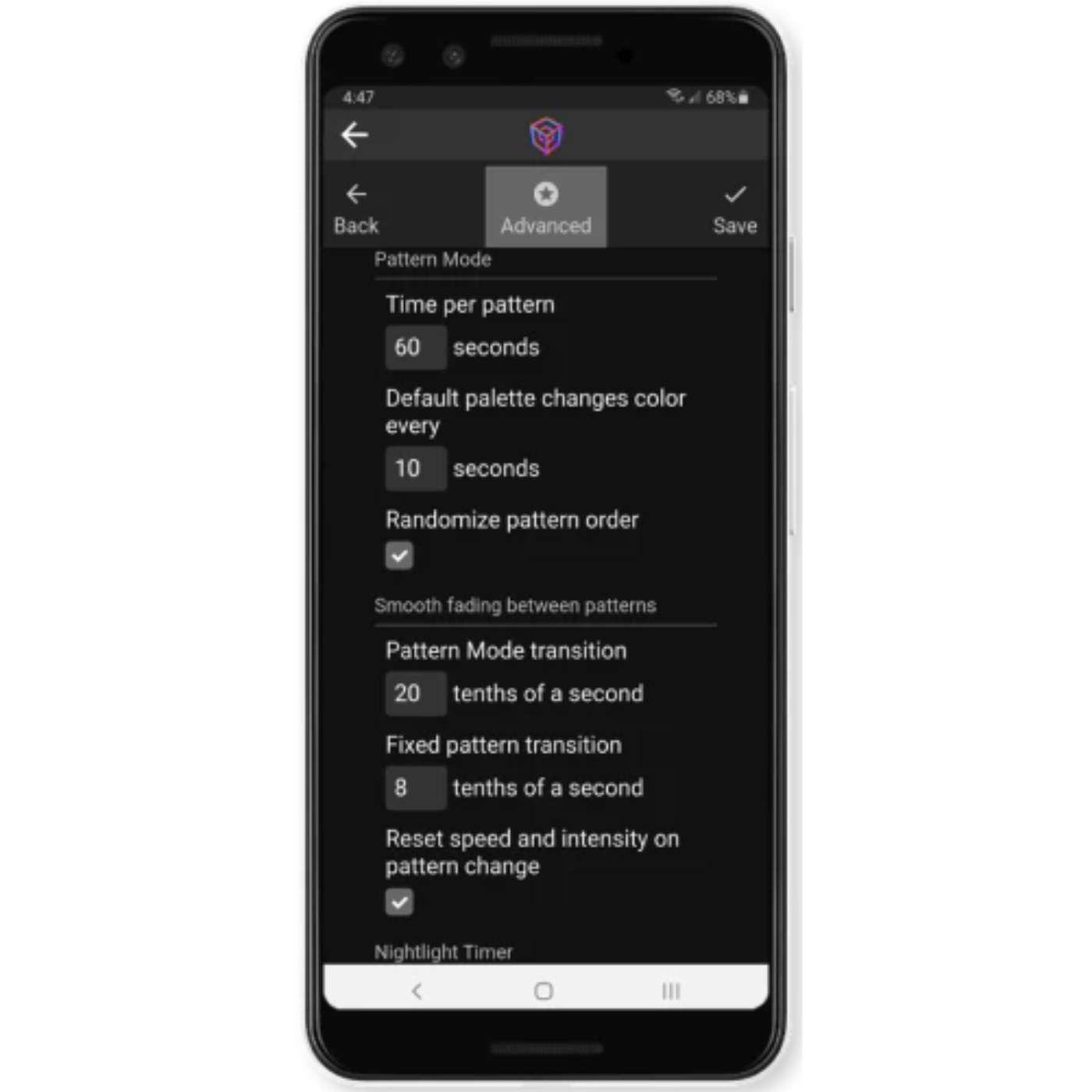 Paramètres de configuration approfondis, y compris l'ordre aléatoire des motifs, la vitesse de transition des motifs, la sensibilité du microphone, et bien plus encore.